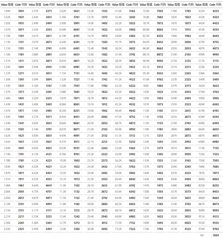 下表列出每種系列的厚聲電阻的標準阻值,表中的阻值是按照通用倍率得出的接近阻值。