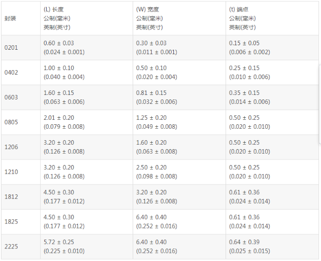 1、封裝尺寸:通用型貼片電容包括四個(gè)常用的封裝:0402、0603、0805、1206。