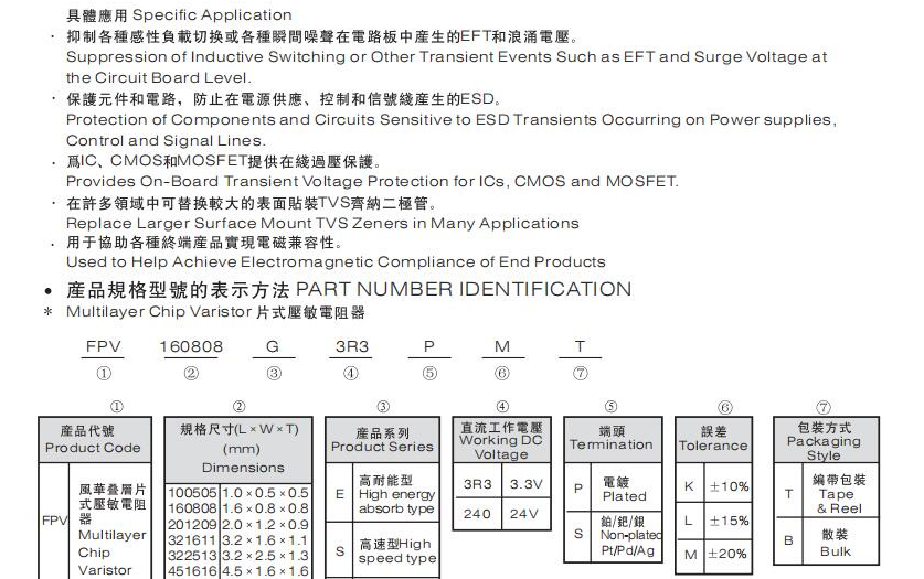 如上圖所示,風(fēng)華的貼片壓敏電阻FPV系列共有四種,通用系列是FPV貼片壓敏電阻主要的一種,工作電壓寬,可靠性強(qiáng),應(yīng)用非常廣泛,可以為各種IC提供浪涌電壓保護(hù),替代齊納二極管,而高耐能系列專為吸收電路中存在的能量較大的瞬態(tài)電壓噪聲而設(shè)計(jì)的,保護(hù)原件和電路為IC,CMOS和MOSFET提供在線過(guò)壓保護(hù),在許多領(lǐng)域可替換較大的貼片TVS齊納二極管。高速系列貼片壓敏電阻容量非常低,為高速數(shù)據(jù)線和其他高頻領(lǐng)域提供ESD和EFT保護(hù),應(yīng)用在視頻音頻接口,便攜式手提設(shè)備,工業(yè)及醫(yī)學(xué)儀器,包括液晶顯示器LCD。貼片壓敏電阻所占的空間更少,可以減少PCB板面積,用于多線浪涌抑制,應(yīng)用在各種多線浪涌抑制且對(duì)空間要求苛刻的電路板中。