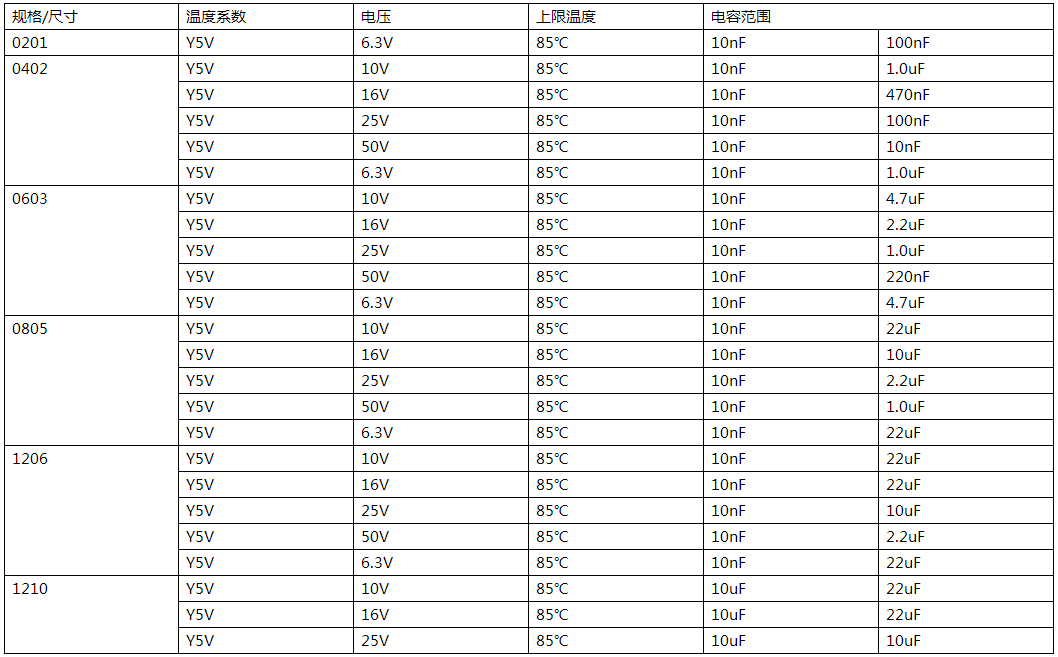 國巨CC Y5V電容常用參數表